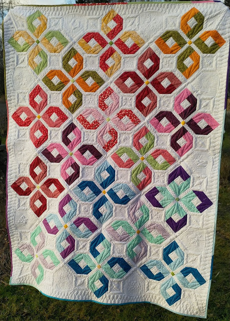 Tässä uusin valmistunut tilkkutyö. Lahjapakettiin menee. Harjoittelin tässä viivotintikkausta. Halusin tikkauksella korostaa kukkasten väliin jääneitä sekundäärikuvioita, eli pieniä neliöitä. Tästä tuli aika hieno. Ainoa juttu mikä harmittaa on se, että reuna on vähän aaltoileva. Uskoisin sen johtuvan siitä, että koska blokit on kärjellään, reunoista tulee vinoon leikatut eli venyvät. Vaikka kiristin kanttia sitä ommellessa niin reuna jäi silti paikoin aaltoilemaan. Olisi siis pitänyt kiristää enemmän. Voi olla, että puran sen ja ompelen uudestaan. Nyt hetken kuitenkin nautin tästä ainakin toistaiseksi valmiista saavutuksesta. Jahuu!